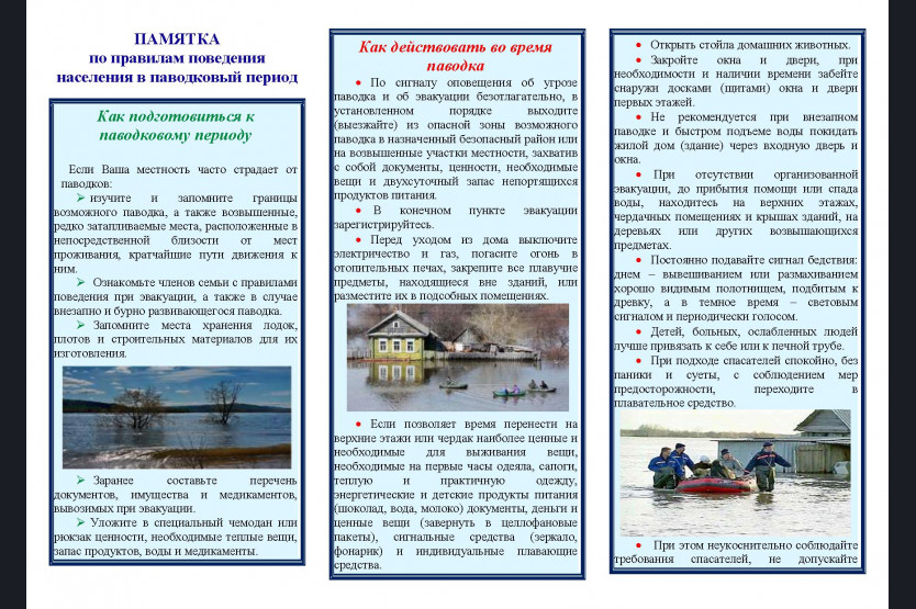 • В период паводка (особенно в населённых пунктах, где возможно подтопление) необходимо постоянно держать включённым радио или телевизор, так как большая вода может прибыть неожиданно.